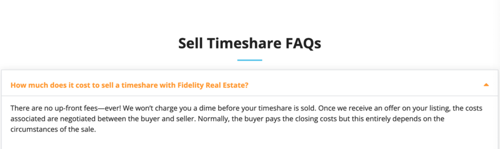 In the case of Fidelity Real Estate, the offer is more about selling the timeshare than it is exiting the contract. So, with Fidelity Real Estate, you aren’t asked to spend anything upfront to get started with the listing. There will be fees associated with the actual sale of the timeshare, if you reach that point, but then you’ll be getting results so those fees will be easier to swallow. Completing a sale and getting out of your timeshare isn’t guaranteed when you work with Fidelity, of course, but you can at least take comfort in the fact that no upfront charges will be required to get started.