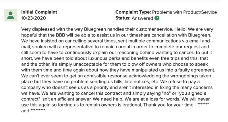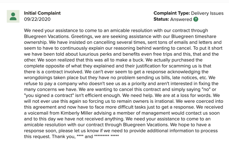 Going down the list of complaints that have been filed against Bluegreen, you’ll see that there are a few common themes. These are the same themes that are typically repeated across the timeshare industry from one company to the next. The two screenshots below capture some of the sentiments that have been echoed by many other people.