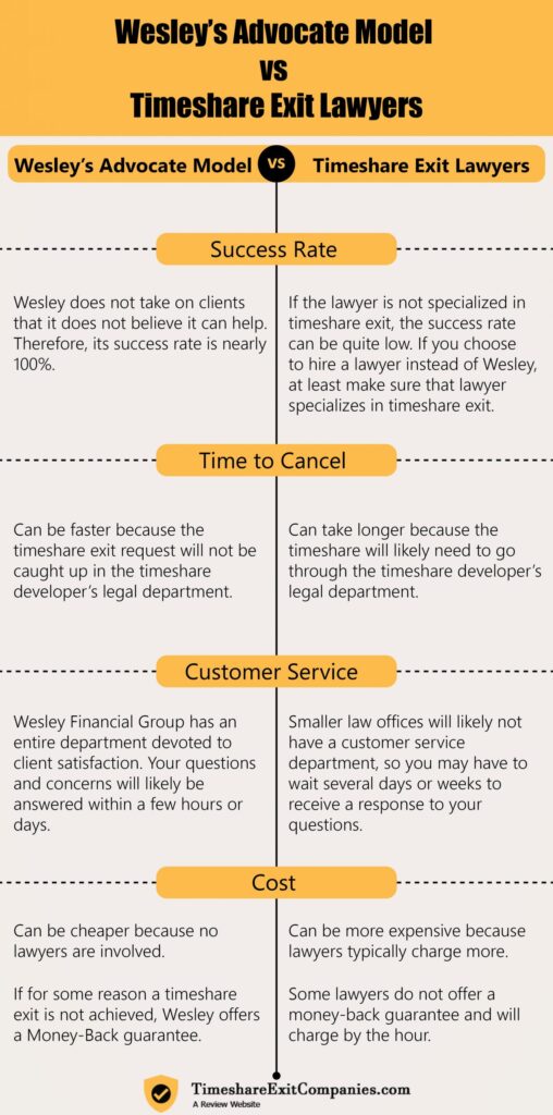 Wesley Financial Group’s timeshare exit process is different from other timeshare exit companies’, in that they use something they call the “Advocate Model.” This is unique to Wesley, and varies a great deal from processes that simply use lawyers to advocate on your behalf. Wesley instead assists their clients to write letters and make phone calls to their timeshare companies, which is not only helpful, but also empowering.