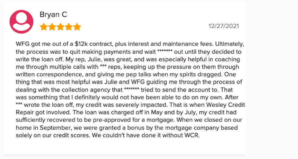 This BBB review is a great example of how thorough Wesley Financial Group’s timeshare cancellation is in general. Not only did they release this timeshare owner, Bryan, from his contract, but they also did the work of walking him through the details of the process. That they followed up to help repair this timeshare owner’s credit speaks volumes, because timeshare owners’ credit is often damaged after the exit process.