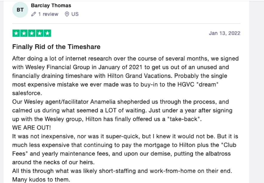 Not only is it incredibly difficult to get out of a Hilton Grand Vacations timeshare – it’s even more challenging to pressure them enough that they actually take a timeshare back. The fact that Wesley undertook steps to make this happen, and did so over nearly a year, says a lot about their work ethic and willingness to help their clients.