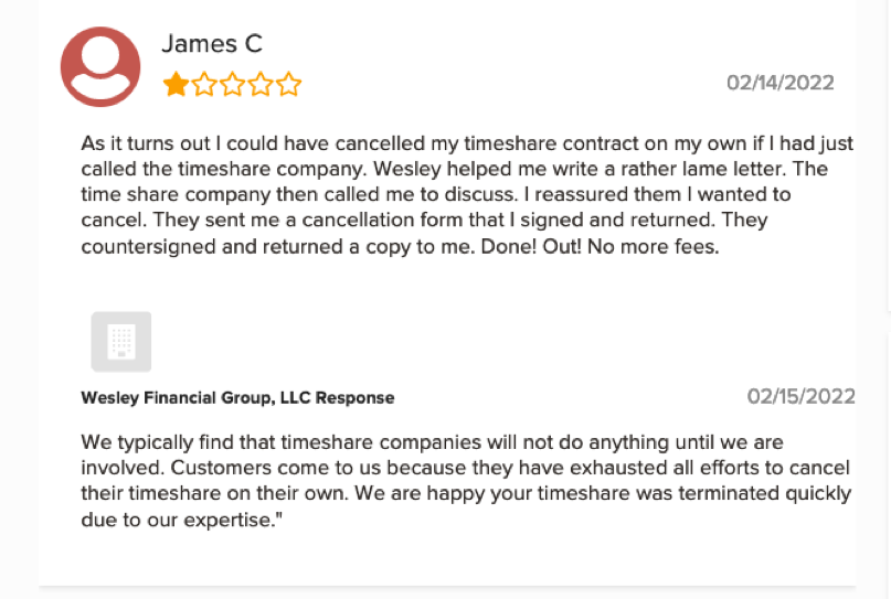 There are so many timeshare exit companies who are so profit-hungry that they take on every client, no matter what, regardless of whether or not they can actually serve them well. Wesley Financial Group is different: they only invest in working with timeshare owners they know they can successfully help. This is likely the reason why they’ve stayed in business so long and can speak so few negative online reviews (and, we should add, so many positive testimonials).